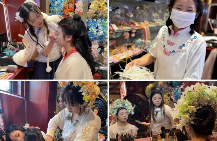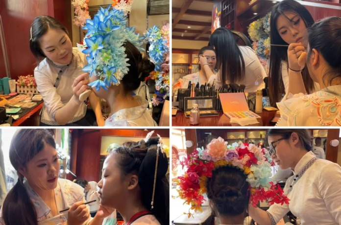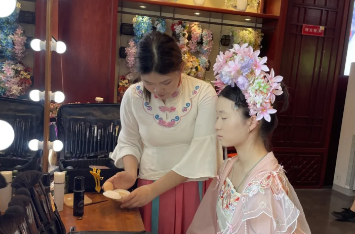为进一步推动产教融合,实现专业学习与企业需求的"无缝对接",4月30号-5月5号,5月18 -19号,5月25-26号,6月1-2号,6月8-10号,设计学院人物形象设计专业分五批选送学生赴荆州方特“楚韵旅拍”开展顶岗实习。由专业教师带队,顶岗实习内容包括簪花、战国袍以及汉服等古风妆造发型和面部妆容设计等。