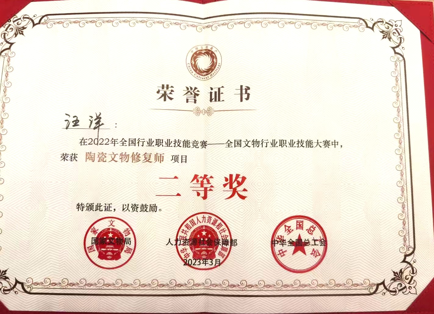 我校2015级学生汪洋荣获2022年全国文物行业技能大赛陶瓷修复项目二等奖!
