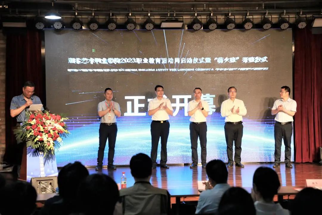 启动仪式上,甘世斌、陈飞、杨峻峰、陈建中、张昉、黄伟共同上台按下手印启动键,湖北艺术职业学院2023职业教育活动周正式开幕。