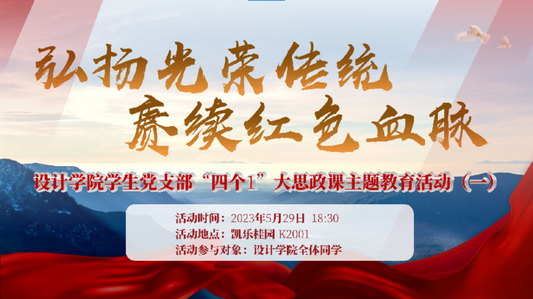 2023年5月29日18:30,设计学院学生党支部组织全体预备党员、发展对象、入党积极分子及有入党意愿的同学们,在凯乐桂园开展了“四个1”大思政课主题教育活动之(一)——《弘扬光荣传统 赓续红色血脉》。