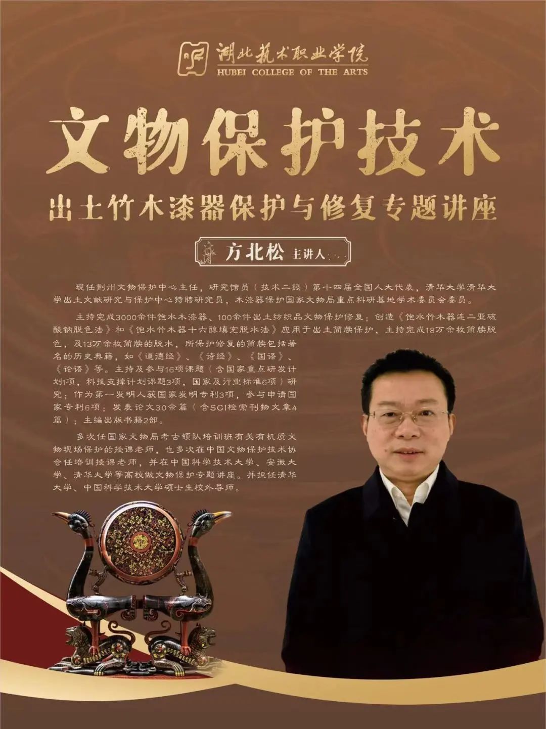 上午,方北松主任在虎泉校区六楼学术报告厅开展了主题为“文物保护技术——出土竹木漆器保护与修复”的学术讲座。文物修复与保护专业全体师生参会。