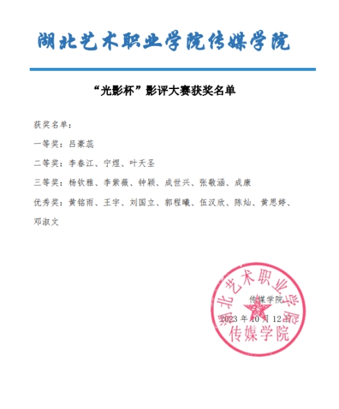 为了丰富职业院校学生的专业知识,激发学生的影评写作热情,激发参与者展开想象的空间进行文学创作,提升传媒学子的审美鉴赏力、人文思辨力和语言表达能力。湖北艺术职业学院传媒学院举办了“光影杯”影评大赛。近日,评选活动落下帷幕。