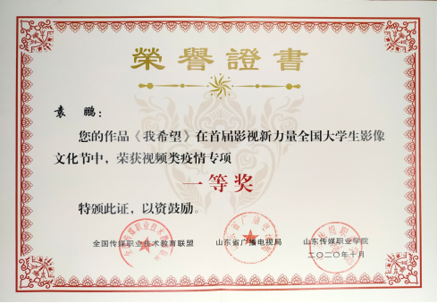 获奖情况:全国传媒职业技术教育联盟、山东广播电视局等联合举办的全国大学生影像文化节一等奖、指导教师奖、优秀组织奖