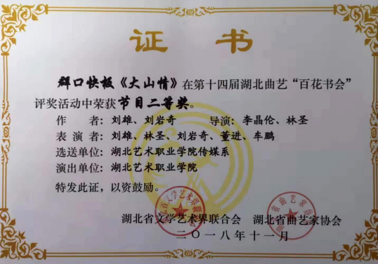 获奖情况:入选第三届湖北艺术节展演,获中国曲艺家协会展演资助、受邀参与南山杯全国曲艺新人新作展演