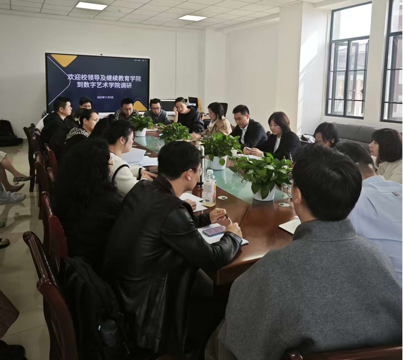 为科学谋划学校”十五五”发展规划,深化跨学院专业协同与资源整合,2025 年 11 月 5 日下午 13 时,湖北艺术职业学院党委委员、副院长罗辉,党委委员、副院长张君带领继续教育学院团队到访数字艺术学院,开展专题调研座谈会。继续教育学院参加本次座谈会的有:院长许慧敏、副院长周东、各业务板块负责人;数字艺术学院参加本次座谈会的有:党总支书记郑伏荣、副院长乔晨、各教研室主任及专业负责人。