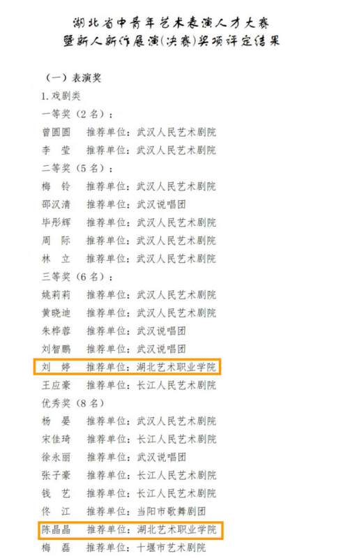 湖北省中青年艺术表演人才大赛暨新人新作展演活动,是由中共湖北省委宣传部、湖北省文化和旅游厅、湖北省人力资源和社会保障厅、湖北省文学艺术界联合会共同主办,涵盖戏剧、戏曲、曲艺、声乐、器乐、舞蹈、杂技等7个艺术门类。 本次活动从6月14日至16日,历时3天共11个场次,拟评选出表演奖一等奖24名、二等奖37名、三等奖46名,优秀奖60名;创作奖一等奖12名、二等奖17名、三等奖24名,优秀奖35名。
