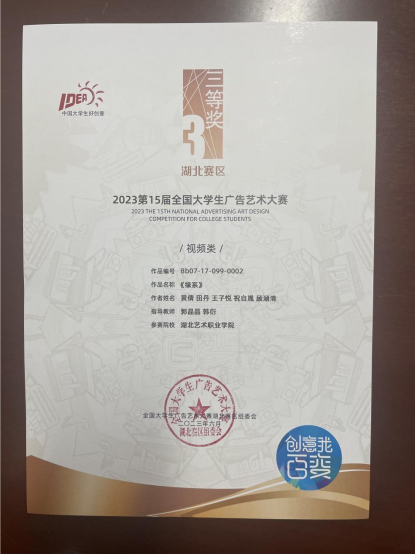 近日,从全国大学生广告艺术大赛湖北赛区(武汉大学)传来好消息,传媒学院在本届大赛中累计奖项17个,其中分获二、三等奖各1个(二等奖作品名称《新衣江畔行》作者姓名:黄春雅刘萌原指导教师:郭晶晶韩衍 三等奖作品名称《缘系》作者姓名:黄倩田丹王子悦祝自胤顾涵清指导教师:郭晶晶韩衍)、优秀奖15个(指导老师:汪天瀛、郭晶晶、韩衍、卢建、闫新悦、杨敏学、杨心怡等)。值得一提的是,本次获奖学生涵盖了传媒艺术群中的全部专业,播音与主持、戏剧影视表演专业学生也首次作为主创获奖。其中,部分优秀作品还将代表湖北赛区参与全国总决选的评审。