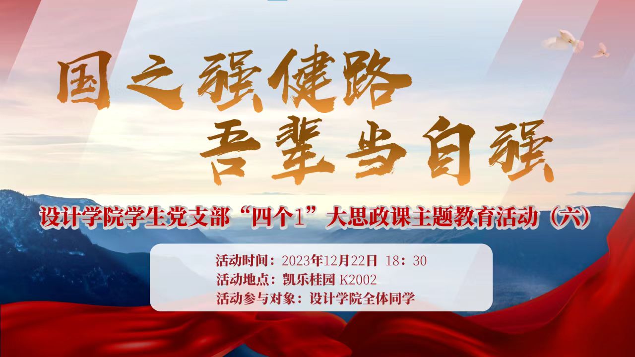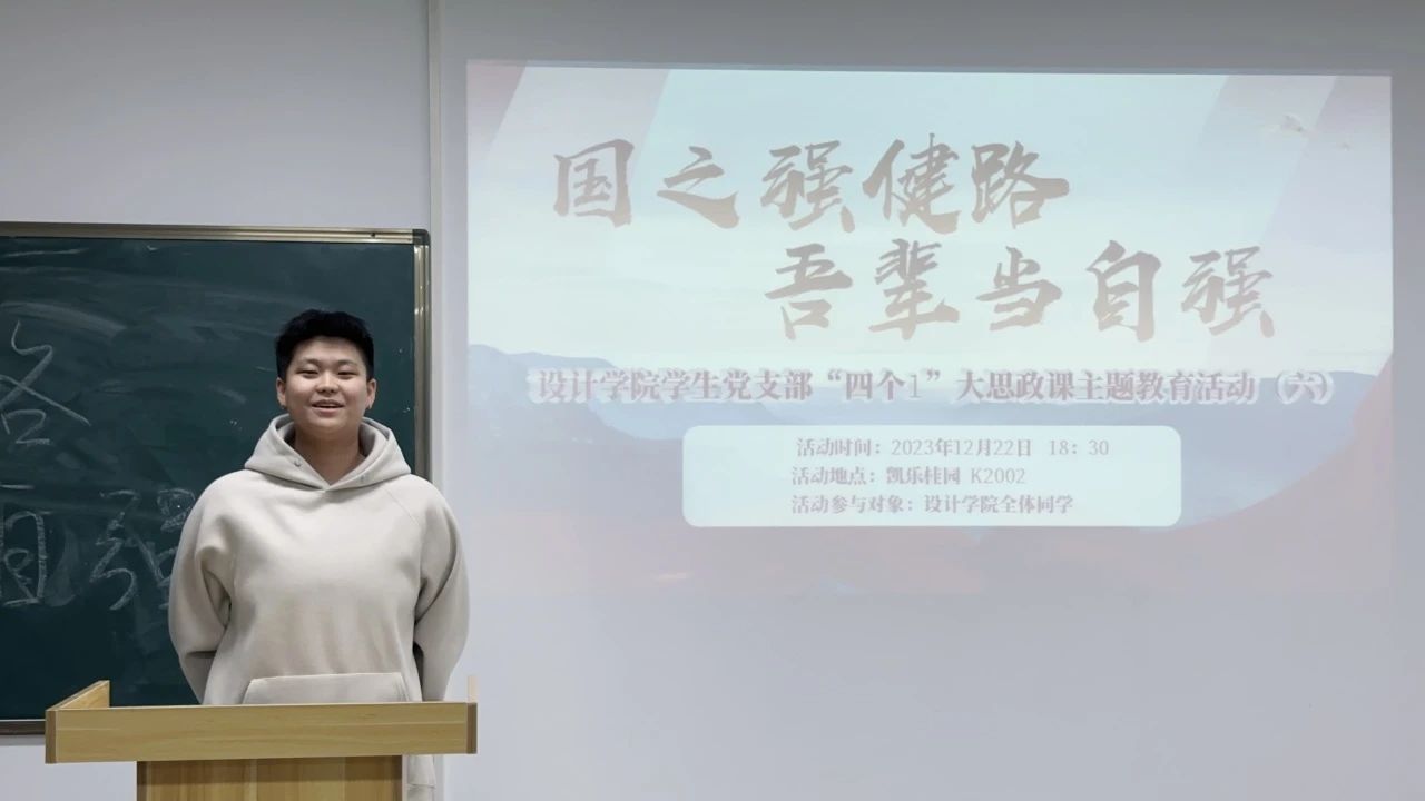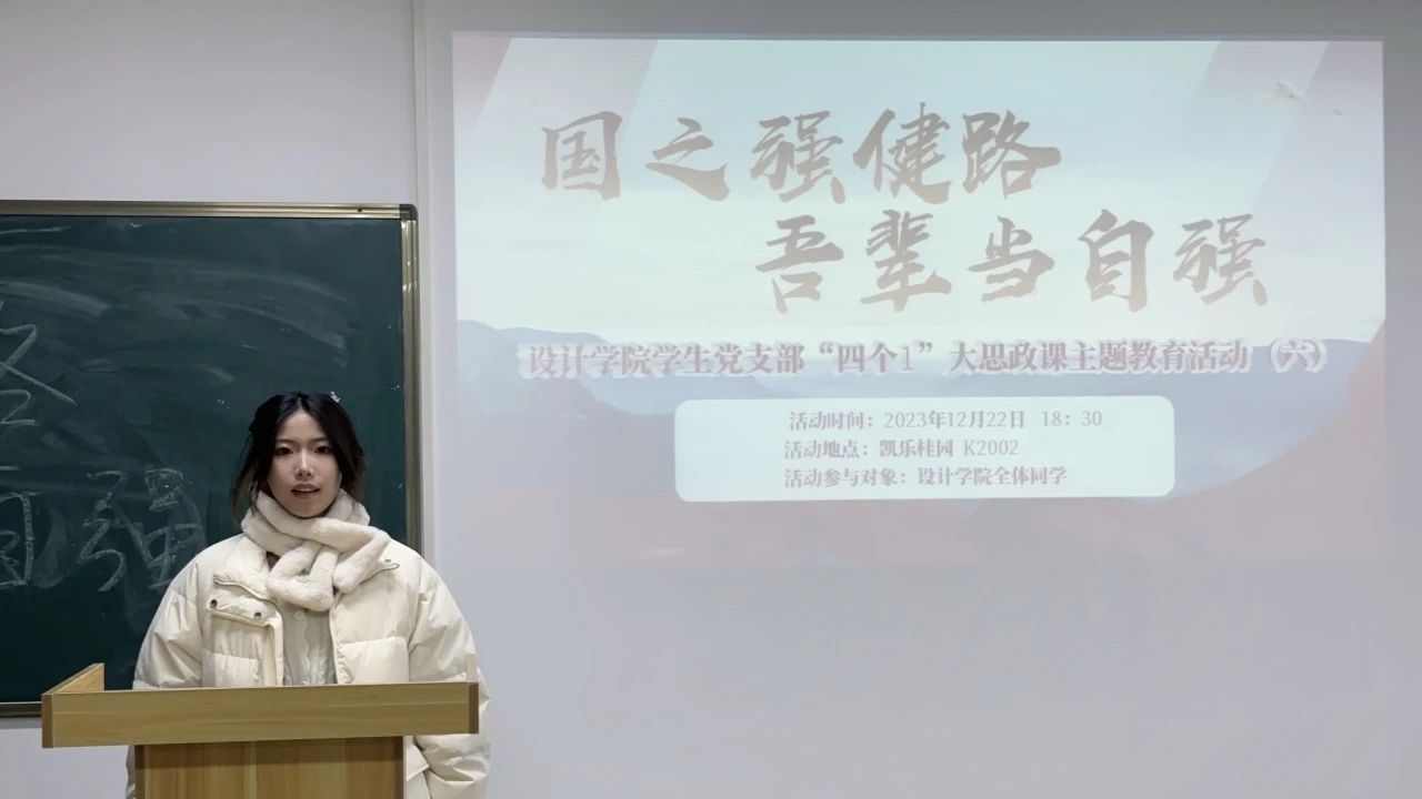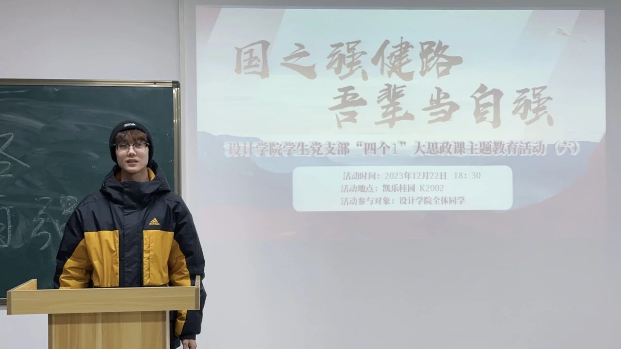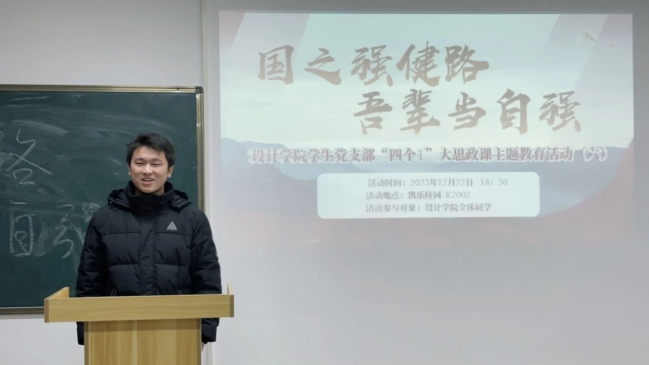 2023年12月22日18:30,设计学院学生党支部组织全体预备党员、发展对象、入党积极分子以及有入党意愿的71名同学开展了“四个1”大思政课主题教育(六)——《国之强健路,吾辈当自强》。