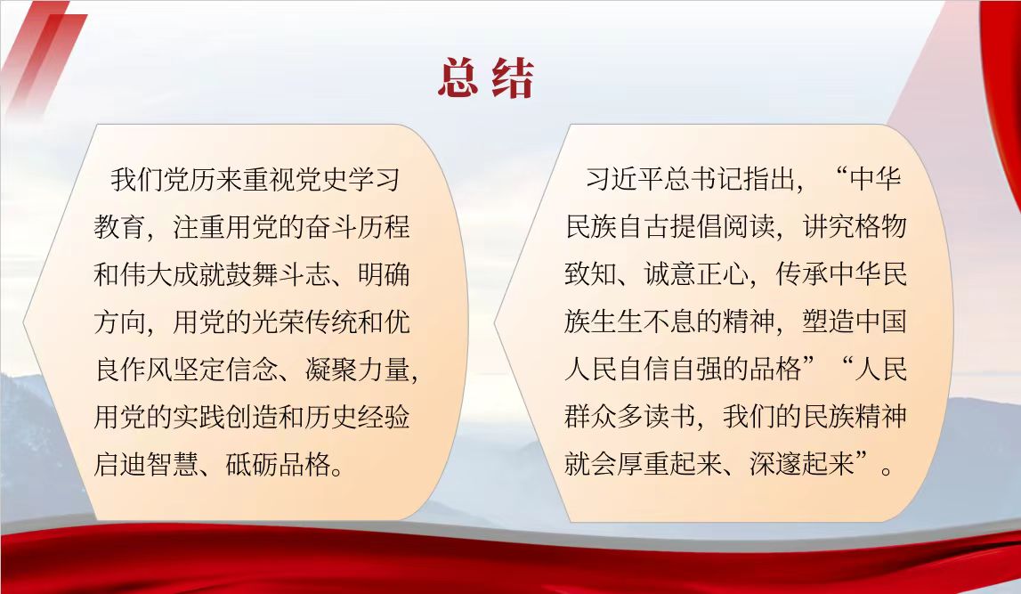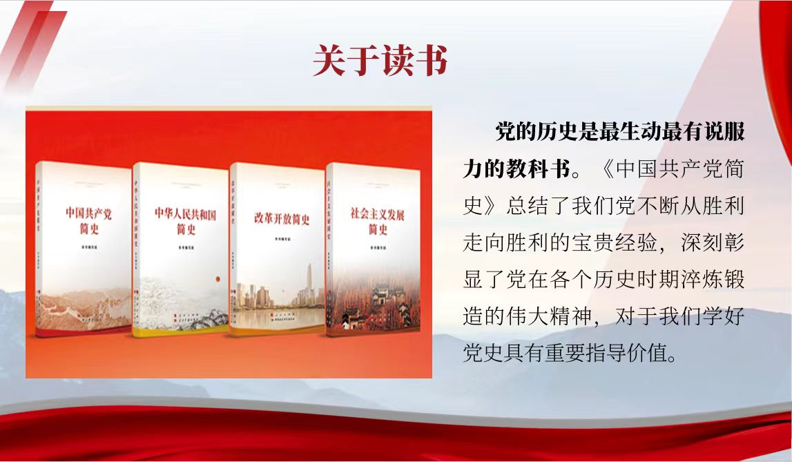 我们党历来重视党史学习教育,注重用党的奋斗历程和伟大成就鼓舞斗志、明确方向,用党的光荣传统和优良作风坚定信念、凝聚力量,用党的实践创造和历史经验启迪智慧、砥砺品格。习近平总书记指出:“中华民族自古提倡阅读,讲究格物致知、诚意正心,传承中华民族生生不息的精神,塑造中国人民自信自强的品格”,“人民群众多读书,我们的民族精神就会厚重起来、深邃起来”。