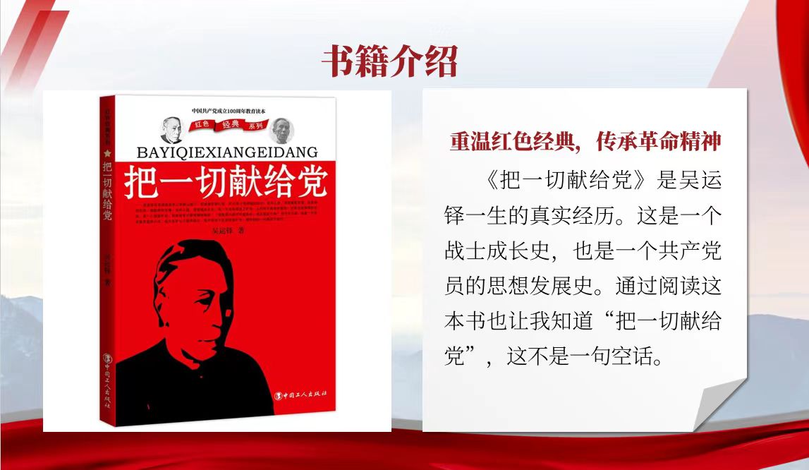 重温红色经典,传承革命精神。《把一切献给党》是吴运铎一生的真实经历。这是一个战士成长史,也是一个共产党员的思想发展史。通过阅读这本书也让我知道“把一切献给党”,这不是一句空话。2009年9月14日,他被评为100位为新中国成立作出突出贡献的英雄模范之一。