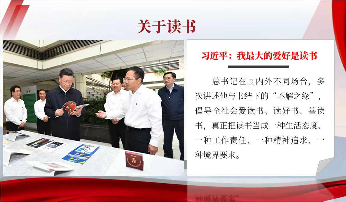习近平总书记:我最大的爱好是读书,在国内外不同场合,多次讲述他与书结下的“不解之缘”,倡导全社会爱读书、读好书、善读书,真正把读书当成一种生活态度、一种工作责任、一种精神追求、一种境界要求。