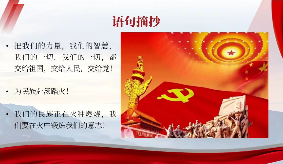 语录摘抄:把我们的力量,我们的智慧,我们的一切都交给祖国,交给人民,交给党!为民族赴汤蹈火!我们的民族正在火种燃烧,我们要在火中锻炼我们的意志!