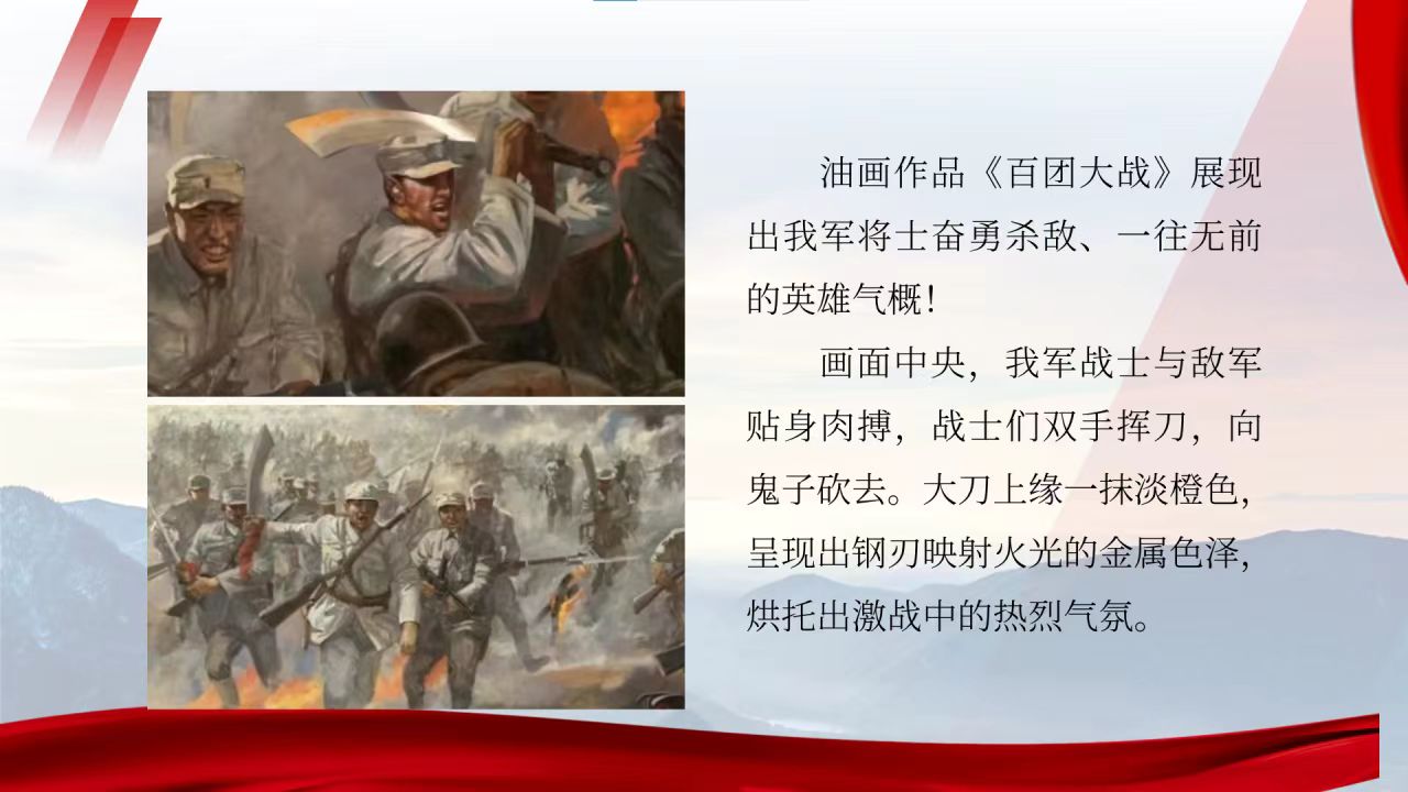 油画作品《百团大战》把观众带入战火纷飞的阵地之上,作画视角独特,由分散到集中,展现出我军将士奋勇杀敌、一往无前的英雄气概!八路军将士挥舞着大刀,给观众带来视觉冲击感。画面中央,我军战士与敌军贴身肉搏,战士们双手挥刀,向鬼子砍去。大刀上缘一抹淡橙色,呈现钢刃映射火光的金属色泽,烘托出激战中的热烈气氛。