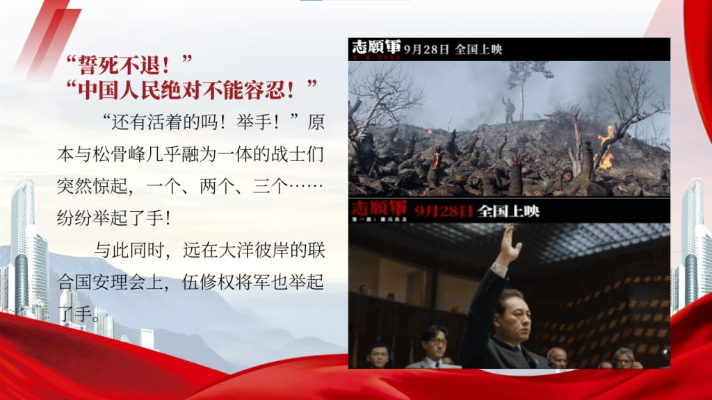 松骨峰上匍匐着被血泥包裹的志愿军战士,他们正在等待时机沸腾;夜晚的大同江中,志愿军战士们直接脱掉棉毛裤,光腿渡江;阻击三所里时,志愿军战士先于敌人五分钟到达,使尽千般手段也不能放过一辆坦克;松骨峰战斗,3连全体战士誓死不退,凭借战术和血肉之躯抵住了美军的一次次冲锋,这些场景都是三年抗美援朝战争的缩影。
