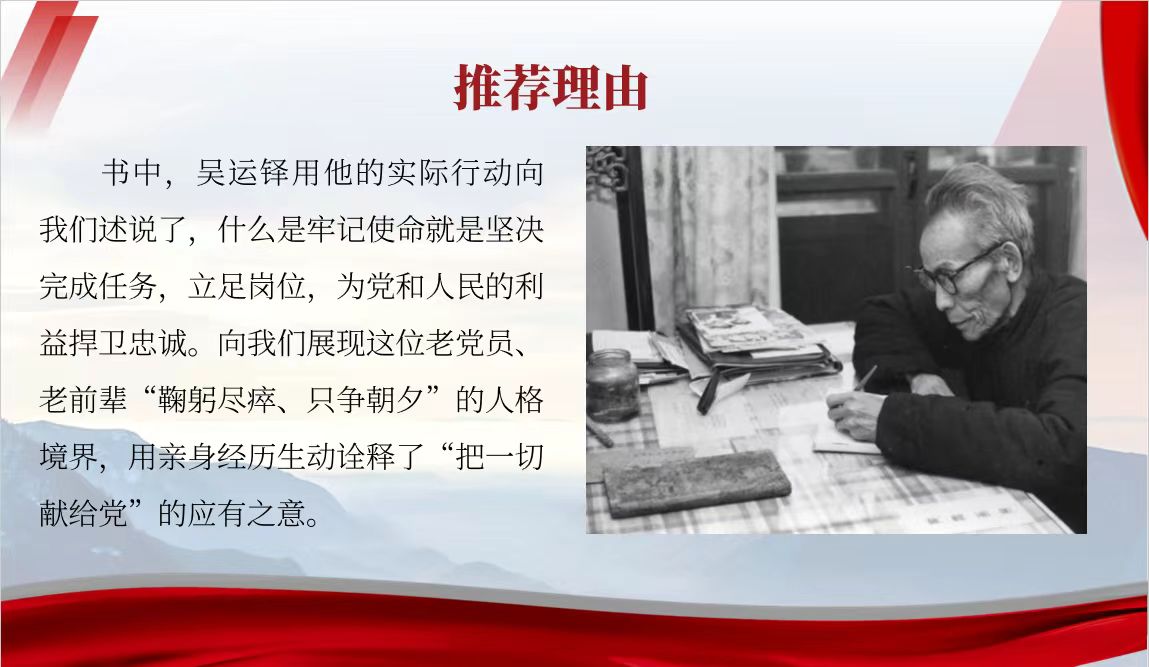 书中,吴运铎用他的实际行动向我们述说了,什么是牢记使命就是坚决完成任务,立足岗位,为党和人民的利益捍卫忠诚。向我们展现这位老党员、老前辈“鞠躬尽瘁、只争朝夕”的人格境界,用亲身经历生动诠释了“把一切献给党”的应有之意。