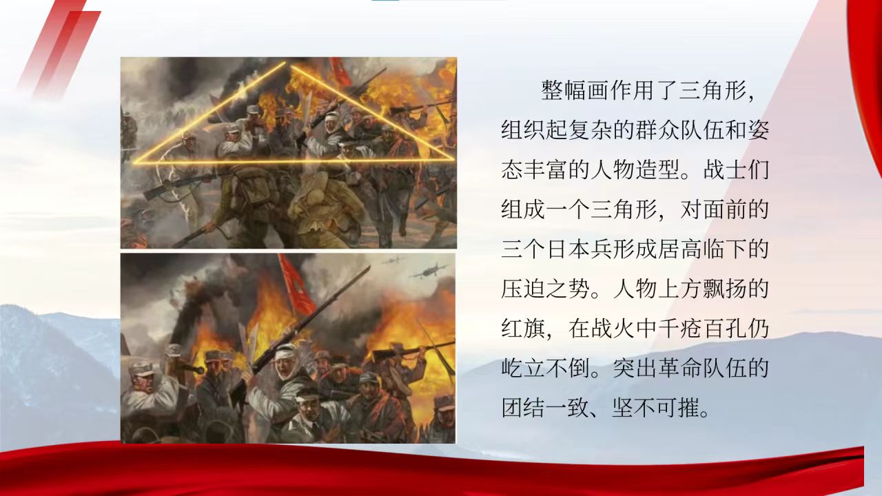 画面运用三角形构图,组织起复杂的群众队伍和姿态丰富的人物造型。战士们组成一个三角形,对面前的三个日本兵形成居高临下的压迫之势。人物上方飘扬的红旗,在战火中千疮百孔仍屹立不倒。人群组合成一个大的三角形构图,体现牢固稳定的结构关系,突出革命队伍的团结一致、坚不可摧。
