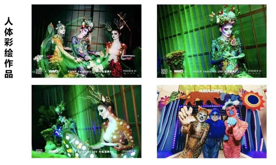 2013年参加上海国际博览中心举办的第15届上海国际汽车工业展会化妆造型;2014年上海风暴电音节人体彩绘;2015年上海外滩时尚婚纱T台秀化妆造型;2016年广告杂志封面拍摄化妆造型;2017年上海耐克专卖店化妆造型等。