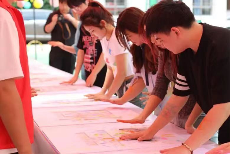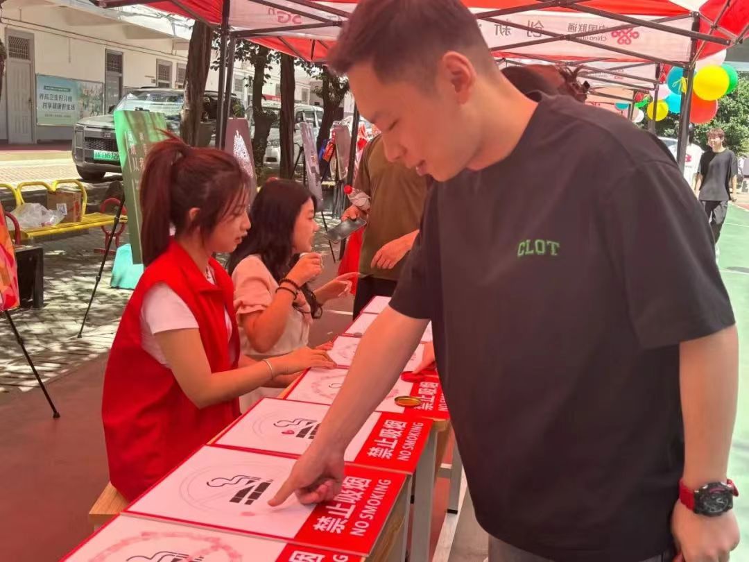 参与者用五颜六色的手印,共同绘制完成富有创意的禁烟标语“打造无烟校园,守护健康生活”,以此达成拒绝烟草的共识,鼓励大家携手传递健康理念,强化控烟意识。