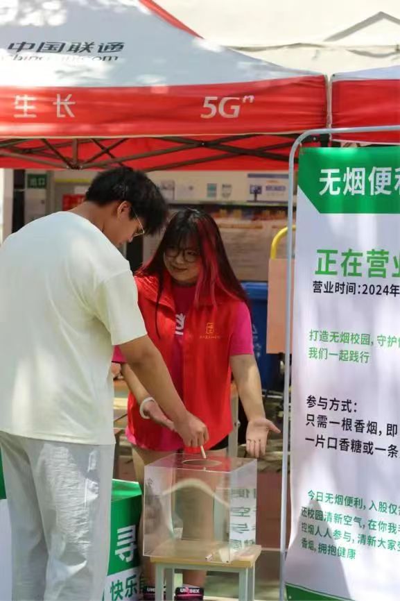 参与者只需要用一根口香糖,即可兑换一片口香糖或一条漱口水,鼓励同学们成为控烟行动的践行者和参与者,多措并构筑无烟校园。