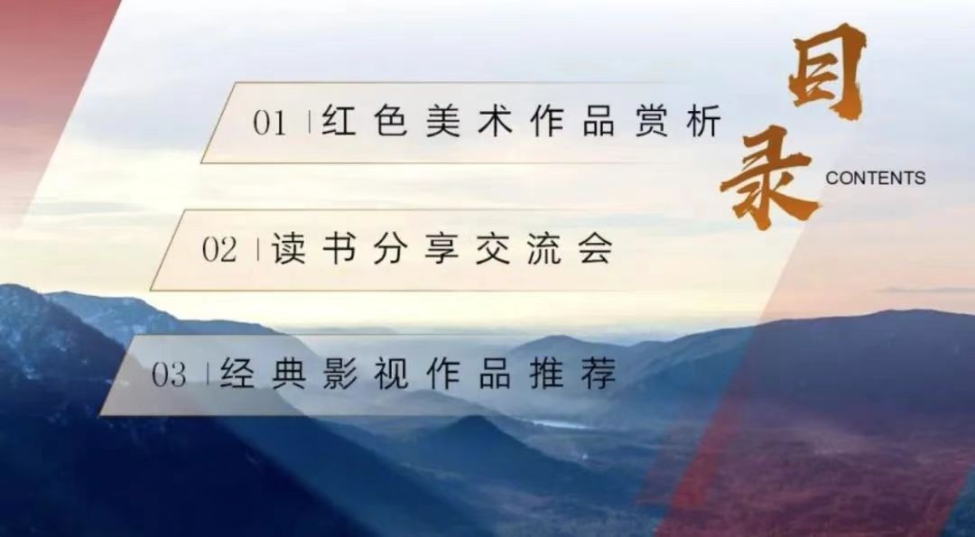 活动分别从红色美术作品赏析、读书分享交流、经典影视作品推荐三个部分进行展开,和大家进行交流分享。