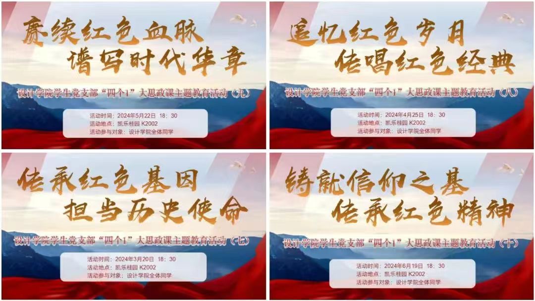 本学期,设计学院学生党支部持续深入开展“四个1”大思政课主题教育活动。主题活动分别为“传承红色基因,担当历史使命”“追忆红色岁月,传唱红色经典”“赓续红色血脉,谱写时代华章”以及“铸就信仰之基,传承红色精神”。全体预备党员、发展对象、入党积极分子及有入党意愿的同学积极参与,累计参与人数达486人次。